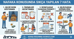 Nafaka davalarında yapılan hatalar, hem tarafların haklarını kaybetmesine hem de sürecin uzamasına neden oluyor. Seyhan Adliyesi’nde takip ettiğimiz davalarda gözlemlediğimiz en sık karşılaşılan nafaka hatalarını sizin için derledik. 1. Gelir Belgelerini Eksik veya Yanlış Sunma En büyük hatalardan biri gelir durumunu kanıtlayacak belgelerin eksik hazırlanması. Çalışan eş sadece maaş bordrosunu getirirken, ek gelirlerini bildirmiyor. Serbest çalışanlar ise gerçek gelirlerini gizlemeye ...
